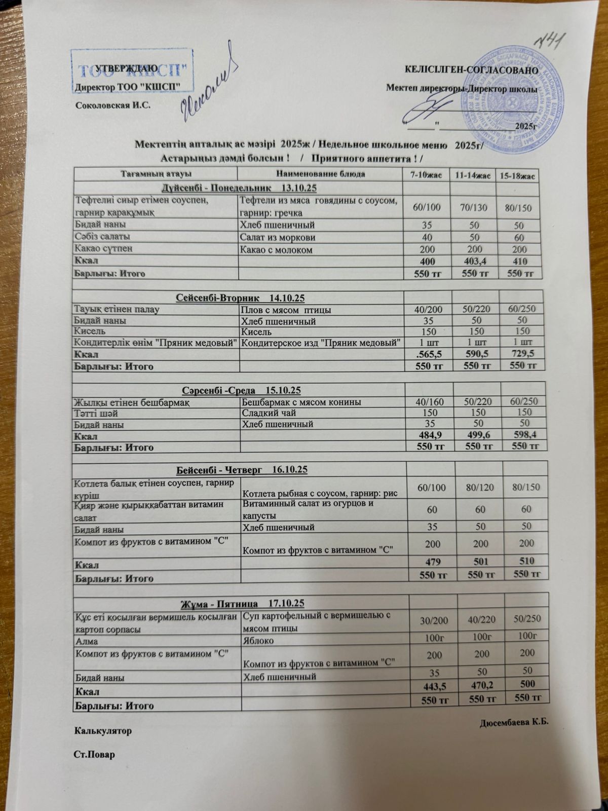 Ас мәзірі 13.10.2025-17.10.2025